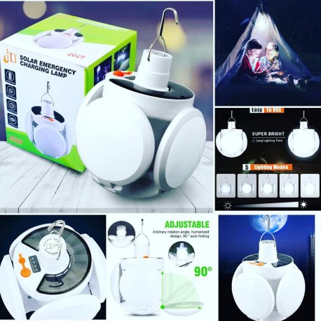 Carga solar diurna y por USB • Estructura blanca • Ideal para camping, galpones y cortes de luz