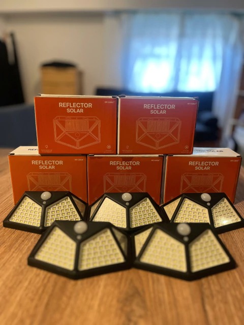 Pack x5 reflectores solares Premium para iluminar exterior sin cables ni consumo eléctrico. Sensor de movimiento PIR e impermeable IP65. Instalás en minutos y ganás seguridad.
